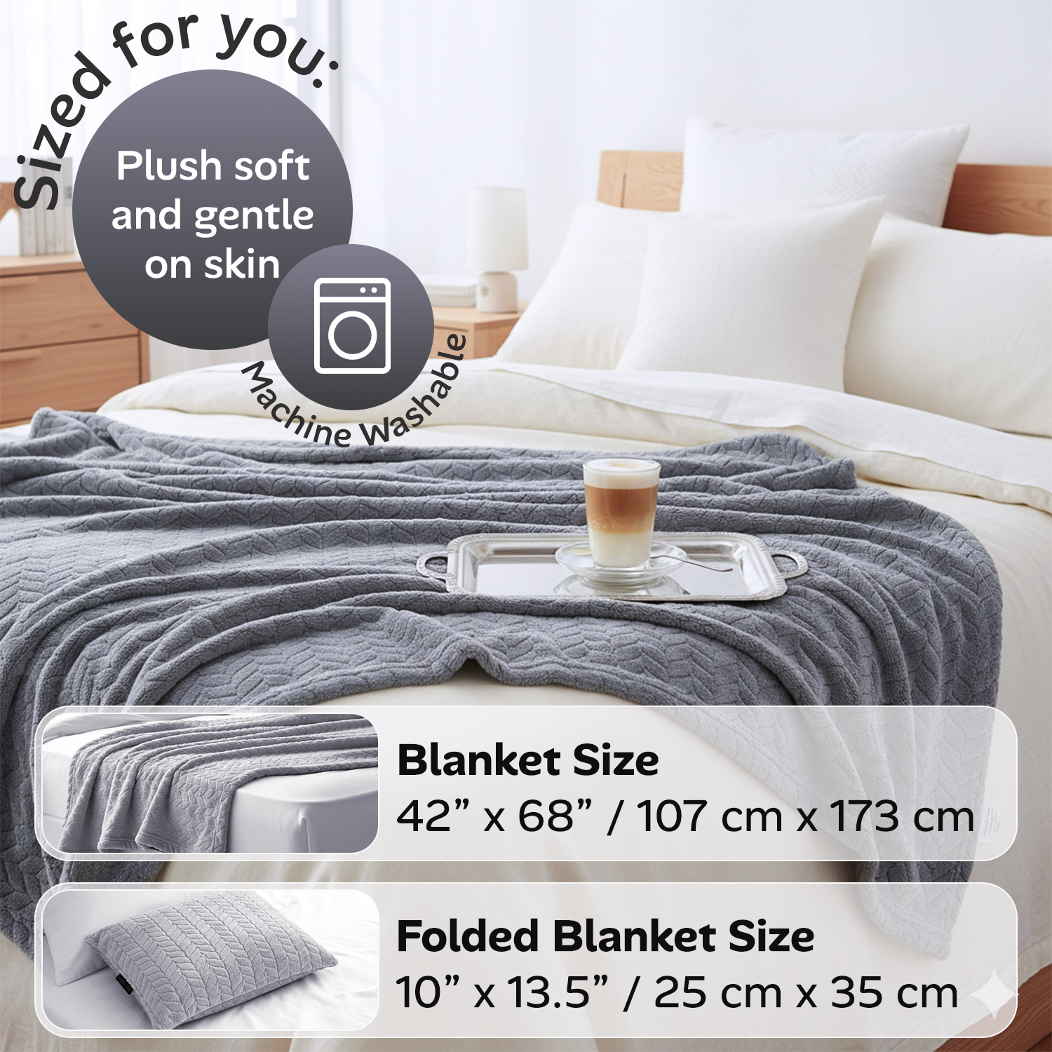 Machine washable for easy maintenance. Wash cold on a gentle cycle and air dry or tumble dry low to keep the blanket soft and travel-ready.